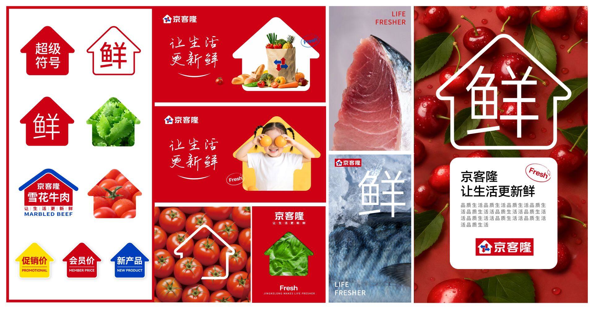新Logo不仅是一个视觉符号,更是“让生活更新鲜,从社区到家”这一承诺的具象表达。箭头象征持续的新鲜输送,“家”代表温暖与守护,两者融合,强化京客隆作为“高品 质社区生鲜食品超市”的市场定位。